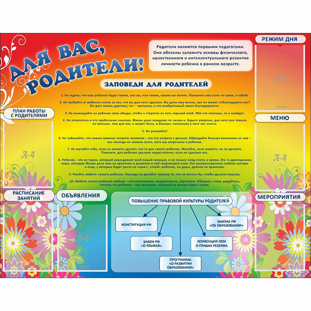 Полезная информация, расписание занятий, правила внешнего вида и поведения, все это важно знать каждому родителю, чей ребенок обучается в детском саду. Поэтому важно донести эту информацию интересно, красиво и оригинально. Поможет в этом яркий стенд, специальный, информационный, который сделан максимально практично. На нем можно сразу разместить несколько объявлений, новых правил, в общем, любую информацию, которая будет актуальна для каждого родителя. А привлекательный внешний вид делает стенд более интересным в дизайнерском отношении. Он станет прекрасным украшением вашего детского сада.