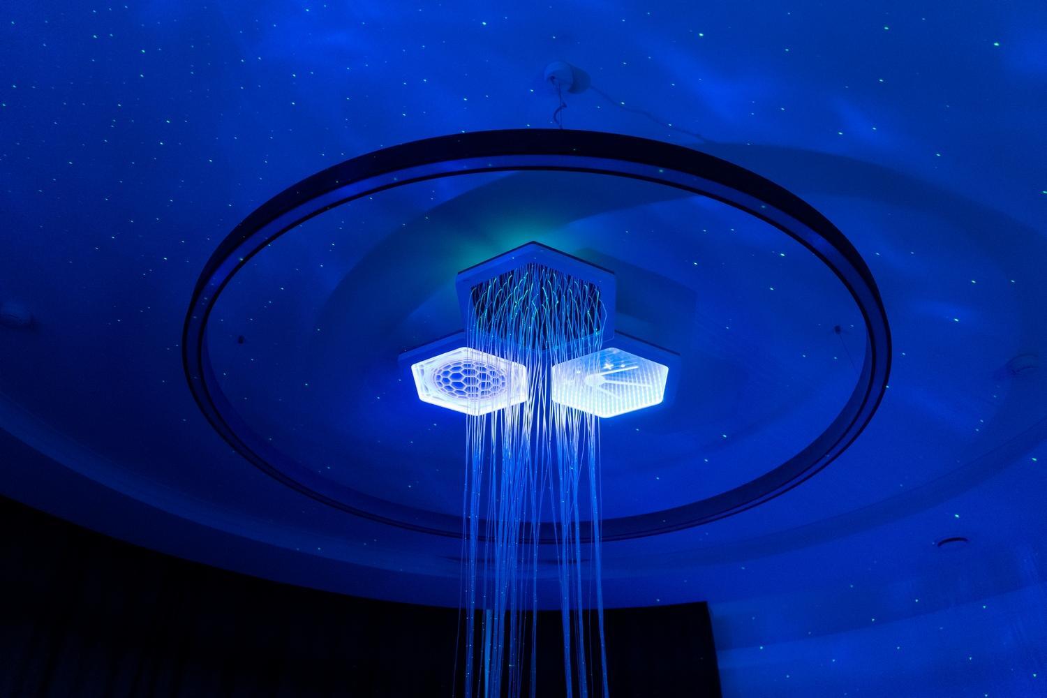 Потолочные панели служат для создания приглушённого успокаивающего освещения. Это способствует успешной психотерапевтической работе с маленькими непоседами. Фибероптические нити поблёскивают огоньками, «Зеркало бесконечности» манит в загадочные миры – всё это помогает отключиться от тревожных мыслей и сконцентрироваться на ощущениях.
