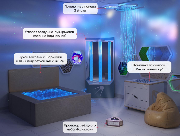 Комплект оборудования решает проблему с поиском различных поставщиков для обустройства сенсорной комнаты и позволяет комплексно оснастить помещение всем необходимым.