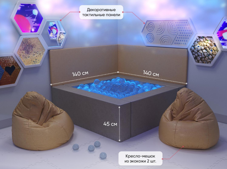 Сухой бассейн с шариками – это универсальное оснащение для сенсорной комнаты, в нём можно как играть и веселиться, так и расслабляться под тихую, спокойную музыку, чувствуя успокаивающее давление шариков на кожу. Подходит для активационной и релаксационной практики.