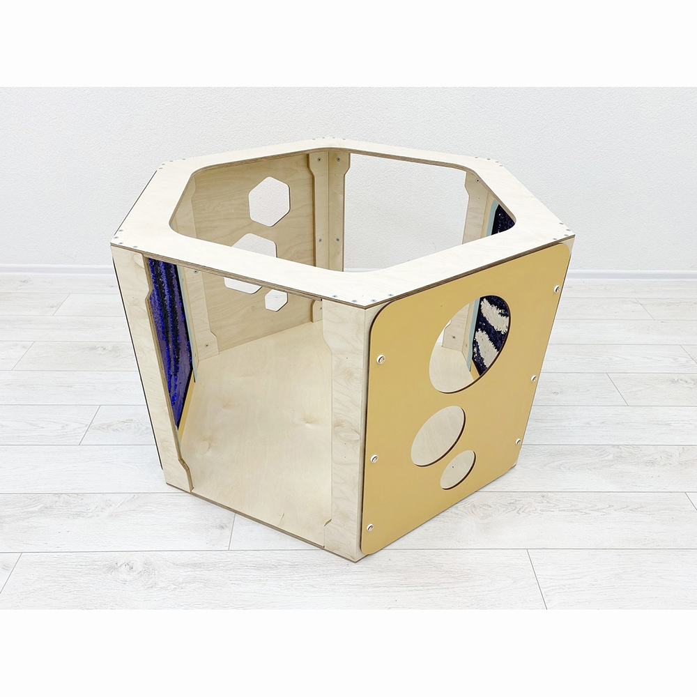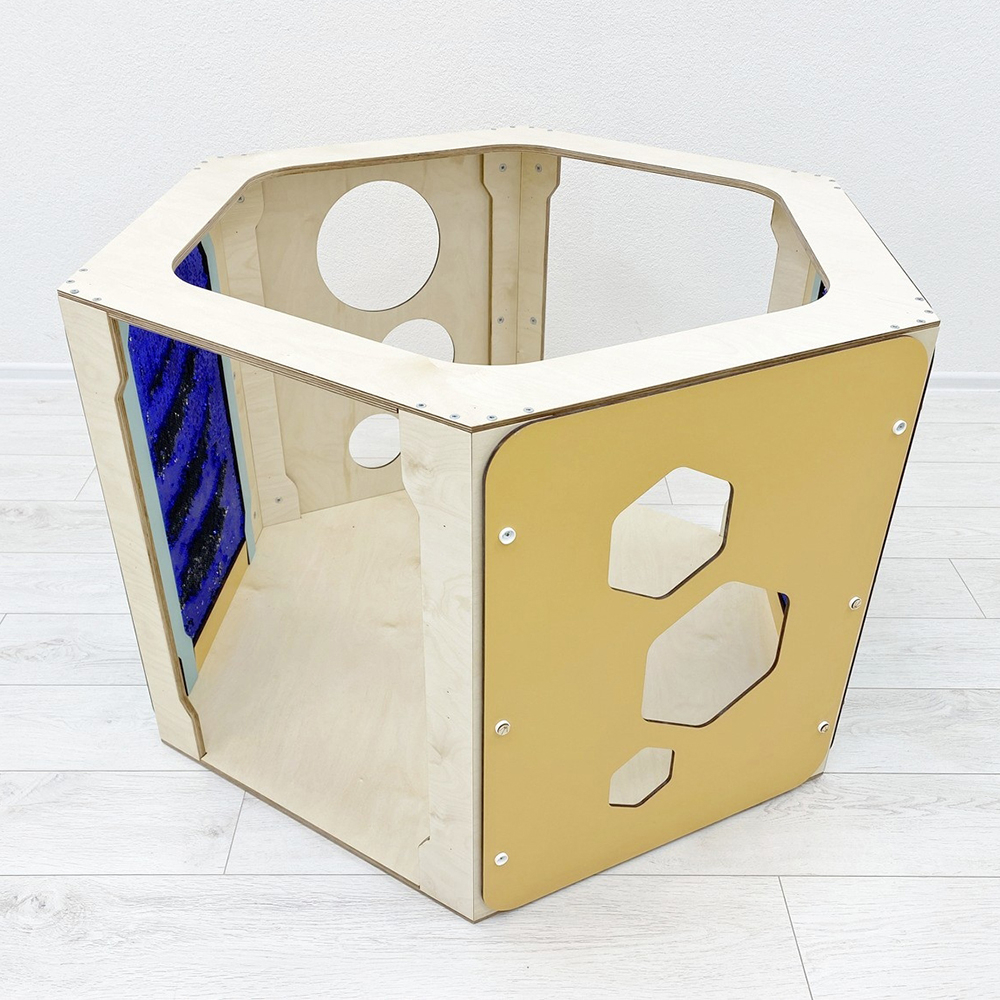 Внутри модули украшены тактильными панелями для развития сенсорной чувствительности, а снаружи – лазерной гравировкой и фигурными окошками. Они идеально стыкуются между собой и позволяют конструировать из них замки и лабиринты для маленьких непосед.