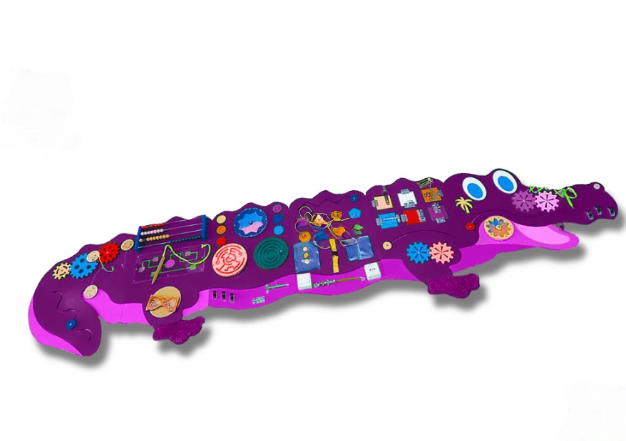 Тактильно-развивающая панель в виде крокодила - это увлекательная и познавательная игра, выполненная из экологичного материала, не оставляет зацепок в детских ручках. Панель состоит из различных предметов и интересных игр. Подвижные цветные шестренки, лабиринт с подвижным шарикам, первые счеты, которые помогут ребенку освоить азы математики. Геометрические фигуры можно вытащить и вставить обратно. Металлический шпингалет и замок развивают у ребёнка координацию движений и ловкость. Она будет интересна и увлечет в игру детей разного возраста. Форма и изображение крокодила познакомить ребенка с миром животных.
