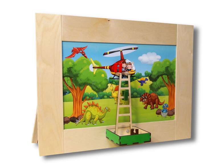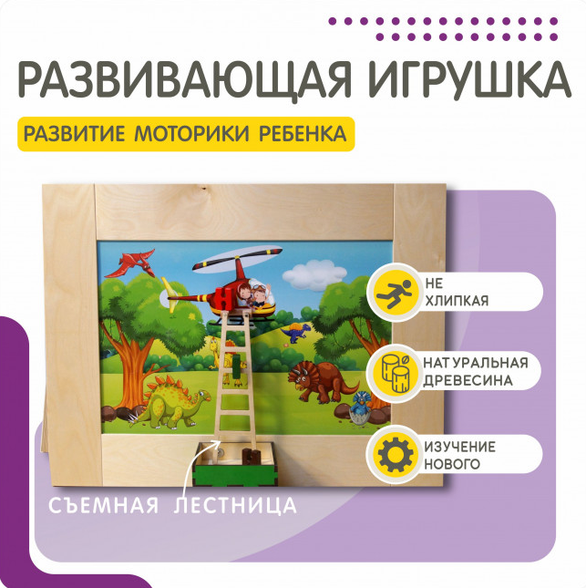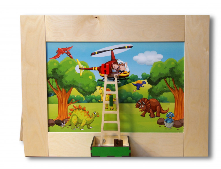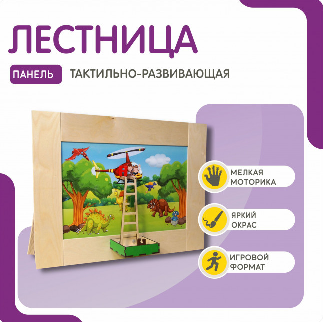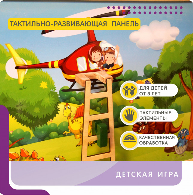 Тактильно-развивающая панель в виде лестницы – это отличный выбор для тех, кто хочет помочь своему ребенку развиться во всех аспектах. Она представляет из себя настольный модуль, который поможет ребенку развить моторику, координацию движений и воображение. Панель выполнена из древесины и имеет стильный дизайн в виде леса с динозаврами, над которым в вертолете летят дети. На панели есть объемная лестница, спускающаяся прямо в ячейку для хранения игровых элементов в нижней части панели.