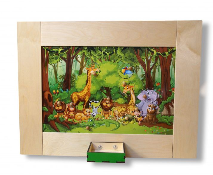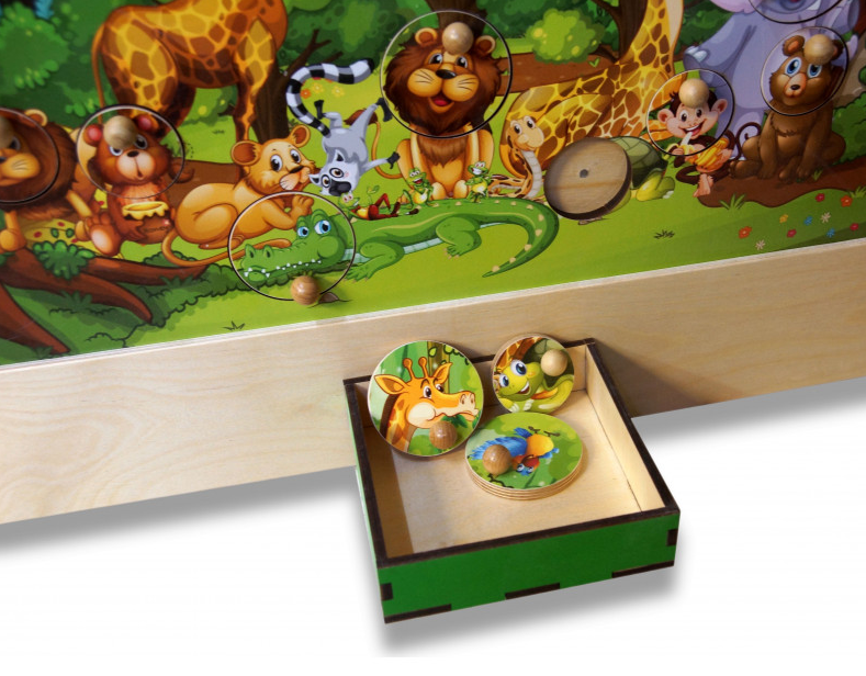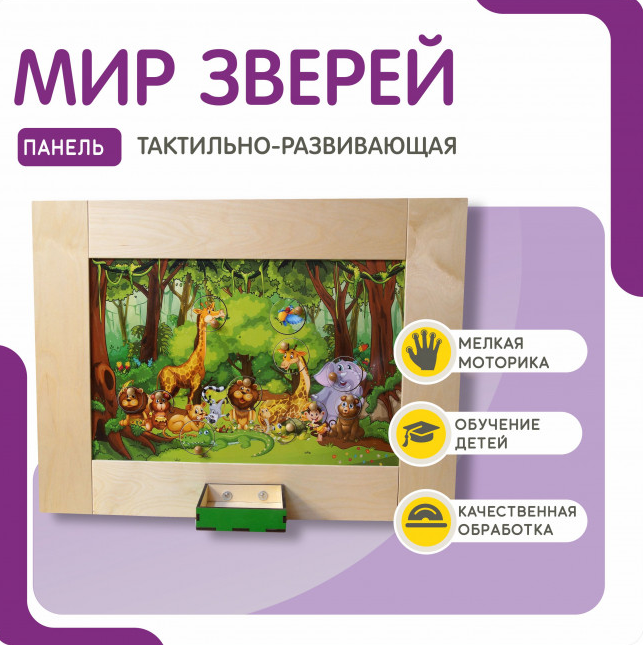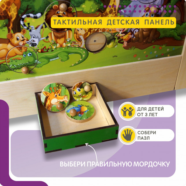 Тактильно-развивающая панель – это настольный модуль, который поможет детям развивать мелкую моторику и тактильные ощущения. Панель состоит из основания и 11 круглых деревянных деталей, на которых изображены мордочки животных. Пазлы имеют одинаковую форму (круг), что усложняет задачу ребенку и требует от него умения правильно подбирать части картинки. Использование такой панели поможет ребенку развить внимание и улучшить память, так как он должен запомнить, какая мордочка животного соответствует определенному месту на панели. Кроме того, данная игра помогает развивать фантазию и воображение, так как ребенок может придумывать различные истории про животных на панели.