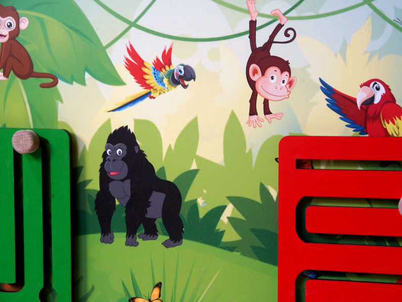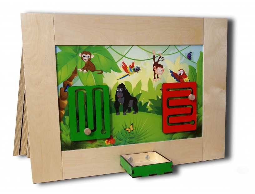 Тактильно-развивающая панель – это настольный модуль, который поможет ребенку развить моторику, координацию движений и тактильные ощущения. Панель выполнена из древесины и имеет стильный дизайн в виде джунглей с обезьянами, попугаями, пальмами и лианами. На панели есть два тактильных лабиринта, а также полочка для хранения игровых элементов в нижней части панели. Это не только увлекательная игра, но и возможность для ребенка развить моторику, координацию движений и тактильные ощущения. Ребенок должен управлять игровыми элементами, перемещая их по лабиринту на панели, что способствует развитию мелкой моторики и координации движений.