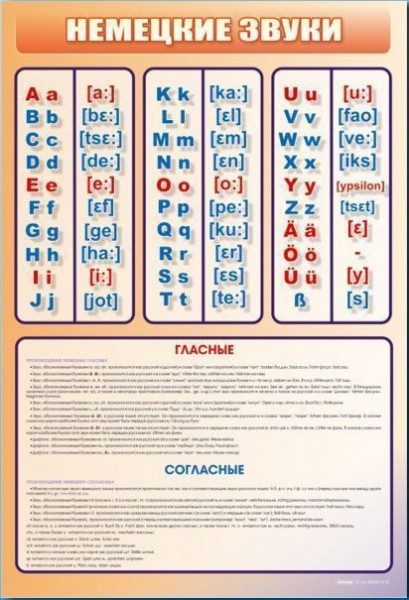Стенд представляет собой панель, на которой размещена информация к уроку немецкого языка. Гласные и согласные звуки выделены разными цветами.