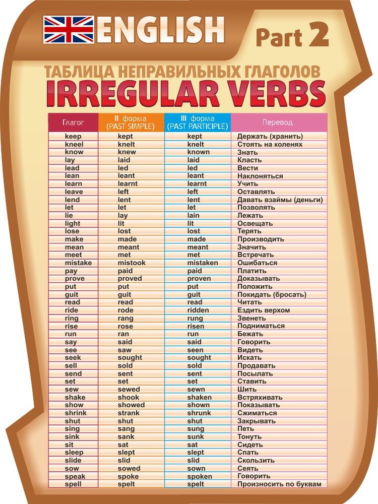 Вторая часть серии наглядных школьных пособий "ТАБЛИЦА НЕПРАВИЛЬНЫХ ГЛАГОЛОВ, ЧАСТЬ 2" подскажет ученикам правописание и русский перевод всех неправильных глаголов в английском языке от буквы K по букву S. Слова представлены в алфавитном порядке - стандартная форма, Past Simple и Past Participle.
