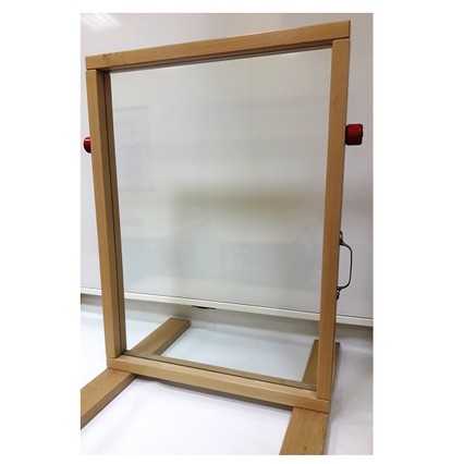 Прозрачный настольный мольберт из небьющегося стекла в деревянной раме. Копии сделанных рисунков можно сохранять, осторожно приложив к сырому рисунку лист бумаги (если рисунок уже подсох, слегка увлажните его, побрызгав водой из пульверизатора). Занятия живописью на стекле – прекрасный способ творческого самовыражения детей, способствующий развитию у них коммуникативных навыков. Рисуя на стекле чей-то портрет, даже застенчивый ребенок получает возможность внимательно всмотреться в этого человека, встретиться с ним взглядом, установить непосредственный контакт. Пользуйтесь только водорастворимыми красками.